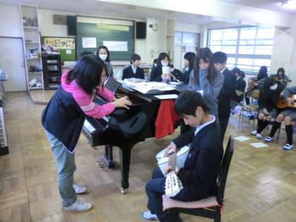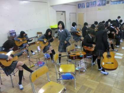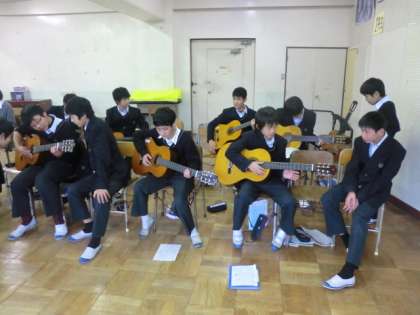 奥山先生の指導で、ギターの練習です。台数が限られているので、途中で交代しながらの練習になります。