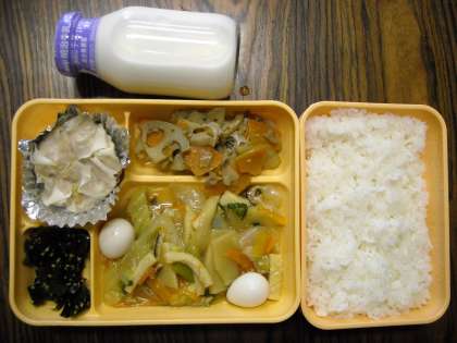 ごはん・八宝菜・ピリ辛れんこん・手作りシューマイ・わかめのにんにく炒め
