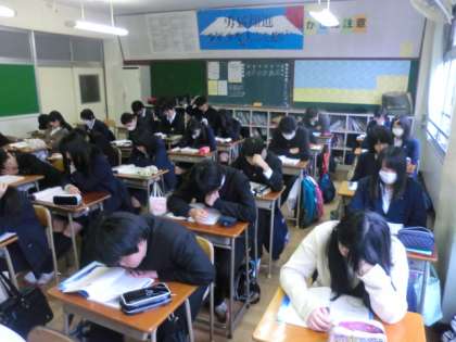 馬場先生の指導で、デッキから流れる朗読を聞いていました。