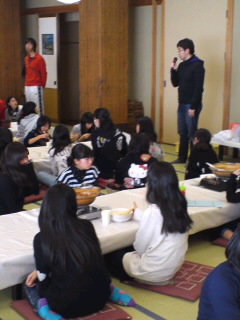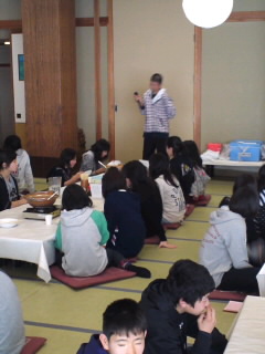 食事係が、ごちそうさまの挨拶をしました。鶴田先生の諸注意の後、部屋に戻りスキーウェアに着替えます。