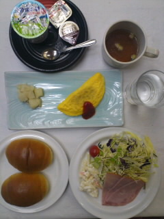 ジャーマンポテト・ハム・マカロニサラダ・ミートオムレツ・ミックスサラダ・ヨーグルト・コンソメスープ・バター・ジャム・ロールパン