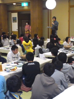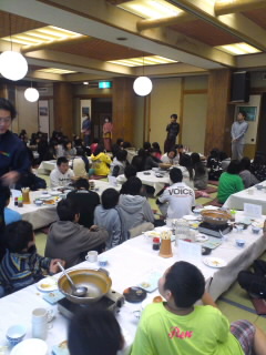 食事係の号令でごちそうさまです。その後、堀越先生からの連絡です。バスの2号車の暖房装置が寒さのため故障しました。2組は他の3台に分乗します。