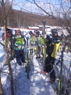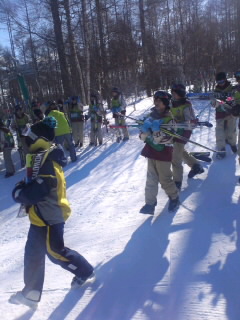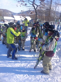 スキー板は班ごとにゲレンデにまとめて立ててあります。
