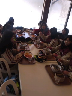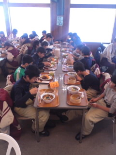 実習班ごとに分かれて食べます。