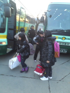 恩方の各降車場所で生徒を下ろしたバスは、最後に恩方中学校に到着しました。ニ泊三日の移動教室の終了です。