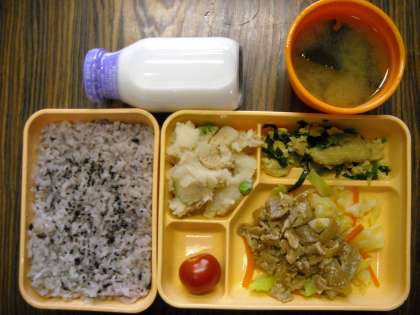 古代米のご飯・豚肉のしょうが焼き・にら玉・ツナじゃが・ミニトマト・みそ汁