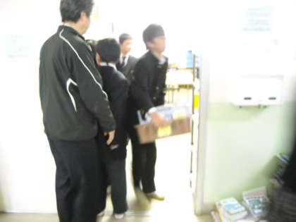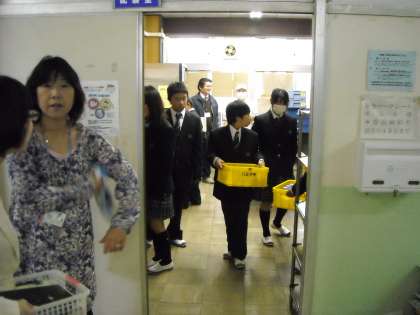 今日から学校給食が始まりました。当番の人が配膳室に撮りに行きます。