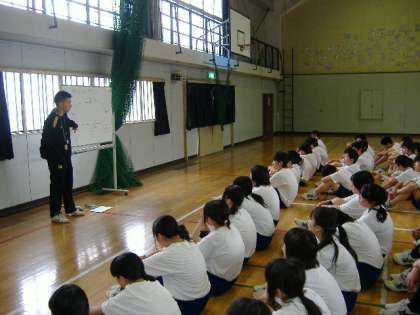 体育館では、運動会に向けて、いかだ流しの授業です。