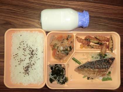 ごまごはん・鯖のつけ焼き青菜のナムル・フライドかぼちゃ豚キムチ・ちりめんわかめ