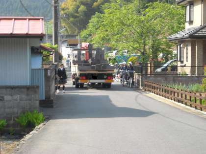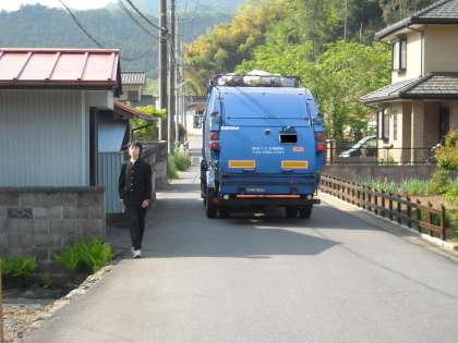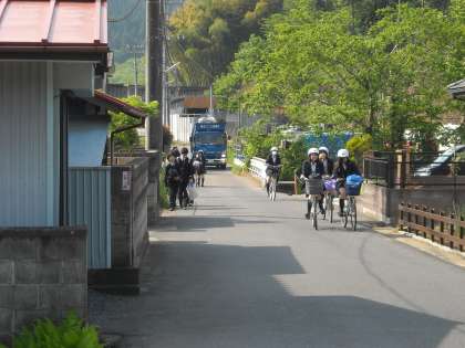 大型のバスやトラックが通るので歩行者は右側、自転車は左側1列で登校しましょう!