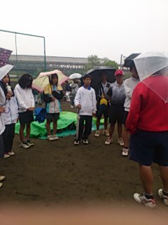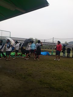 雨が激しくなってきたので、大会は中止になりました。続きは来週の土曜日になります。この大会は上位6校が都大会に推薦されるので、ベスト8に残っている男子にはチャンスです。