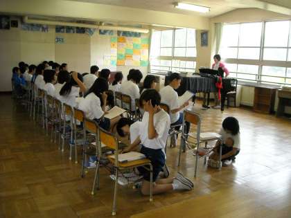 音楽室で奥山先生の指導で楽しく練習をしていました。
