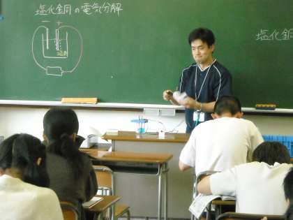 教室で斉藤先生が模擬実験で汗をかいていました。