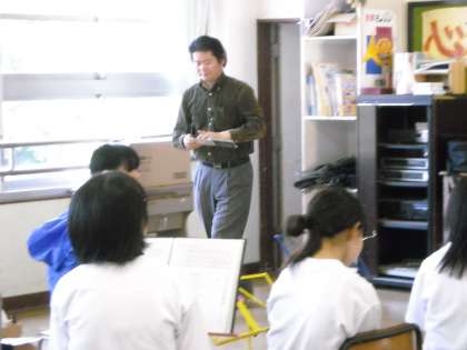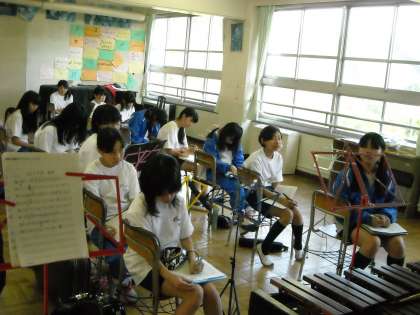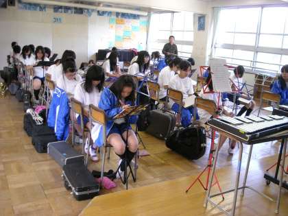 竹信先生の指導で模範演奏を聴いて自分たちの演奏に活かそうとしていました。