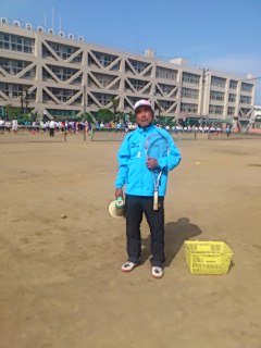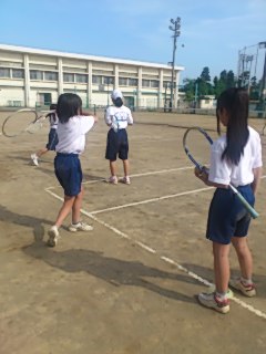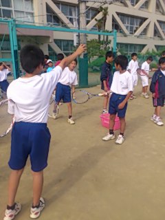 女子と男子の1年生は昭和中学校で開催されている、講習会に参加しています。ソフトテニスマガジンにも連載コラムを持っている、ナロさんの指導のもと、他校の生徒数百人と一緒に練習に励んでいます。