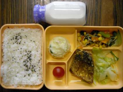 ごまごはん・鯖のカレー揚げ・キャベツの辛味炒め・チンゲン菜のサラダ・