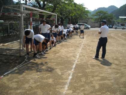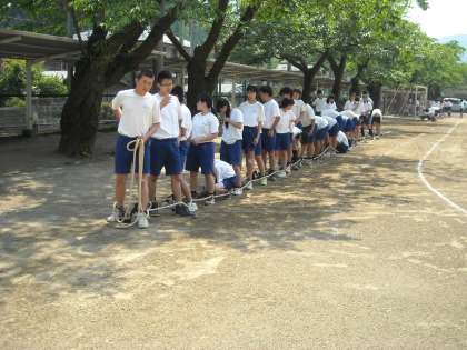 校庭では2クラス合同で狩野・小澤先生の指導の下、大ムカデ競走の練習をしていました。