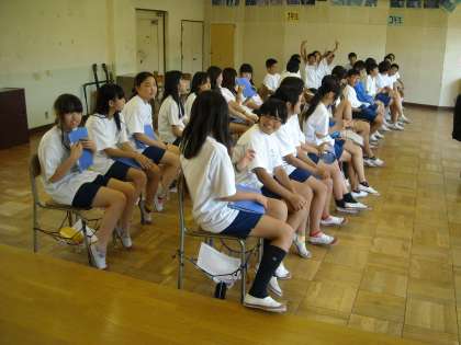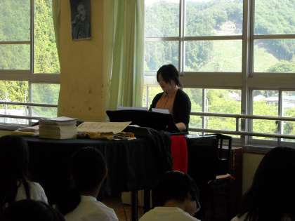 音楽室での授業です。奥山先生の指導で大きな声で校歌を練習していました。