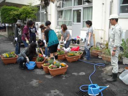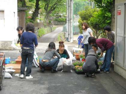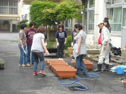 まずは、お母様方が集まって鉢植え作りです。