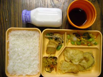 ごはん・天ぷら(いか・さつま芋)。枝豆サラダ・厚揚げの煮びたし・