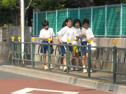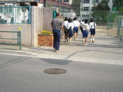 多目的広場で朝練を終えたソフトテニス部1年男子が帰ってきました。