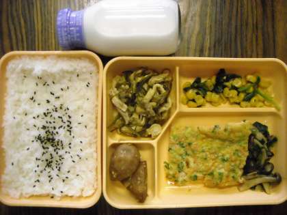 ごまごはん・千草焼き・ほうれん草のソテー・里芋の甘辛煮・クーブイリチー・