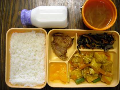 ごはん・厚揚げのカレー煮・ひじきのじゃこ煮・鶏の七味焼き・果物・中華スープ