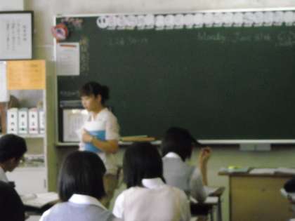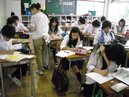 1組の教室では岡部先生が教科書のテープを聞かせながら学習させていました。