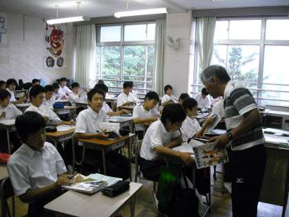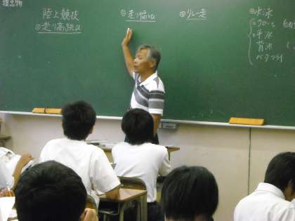 雨なので男子は教室で陸上競技のルールなどについて知識を深めていました。