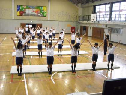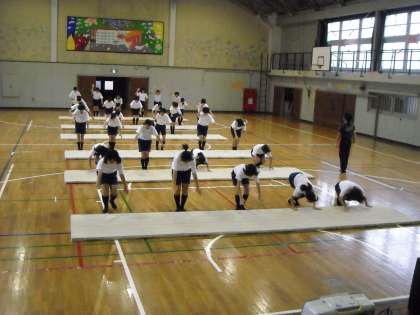 女子は体育館で器械体操です。前転・後転を練習していました。