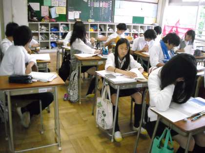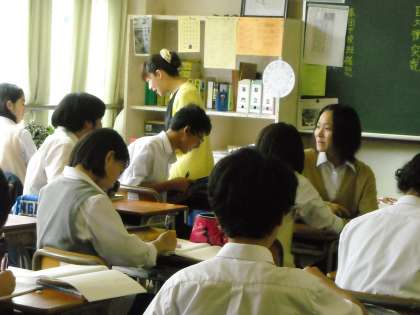 1組では岡部先生が英語の歌を聞かせながら宿題チェックをしていました。