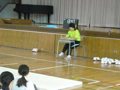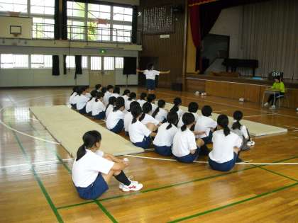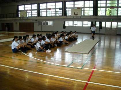 男子は水泳ですが、今日は女子は体育館で小澤先生に見つめられてマット運動の試験です。