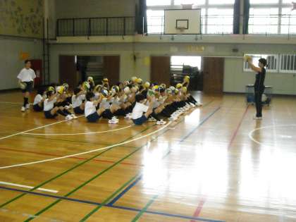 女子は体育館で小澤先生の指導でバレーボールの基礎を学んでいました。