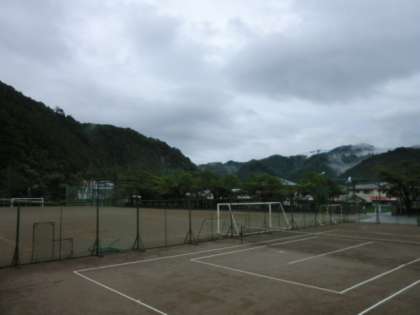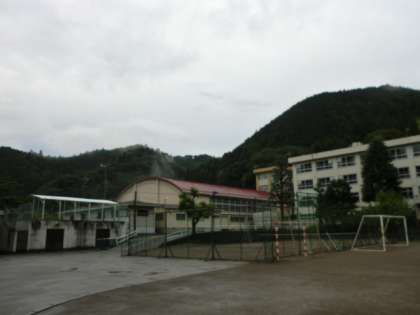 学校の周りの山に霧がかかっています。