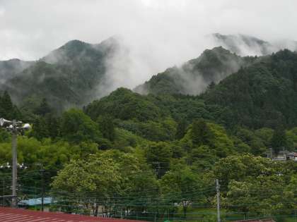 タイトルのように校歌に歌われている恩方の山々ですが、今朝は山の合間から雲が沸き立つようです。