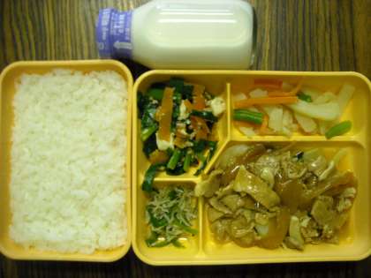 ごはん・豚肉の生姜焼き・じゃが芋の塩きんぴら・豆腐チャンプルー・じゃこピーマン