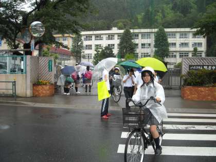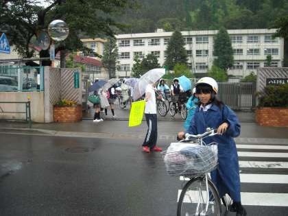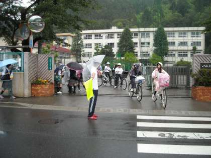 輿水先生が交通指導に黄色い旗を持って立ってくれました。