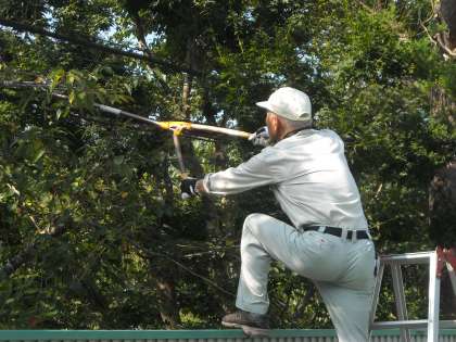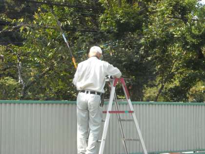 日曜日の昼間にプールの警報がなったのですが、人はいなかったので強い風で枝が触れたのではないかと言うことで、山崎主事に枝落としをしてもらいました。