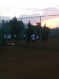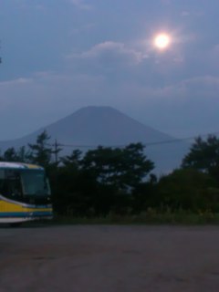 宿を出る時に霧と月明かりの中にうっすらと富士山の登山道沿いの灯りが見えました。