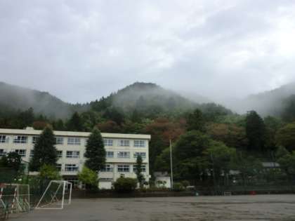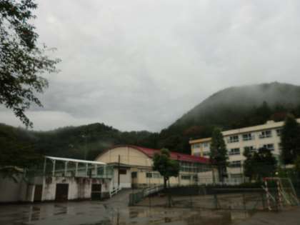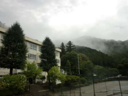 今日は不安定な空模様、周囲の山に霧がかかっています。
