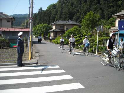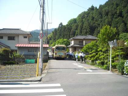 聖パウロ学園の大型バスが狭い道に入ってきます。
