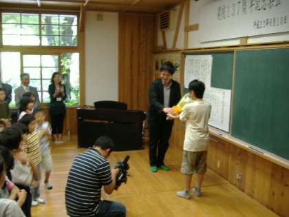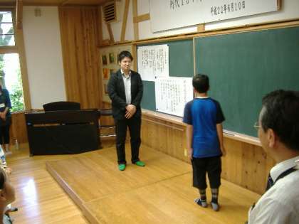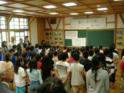 その後「醍醐の里」の合唱や「恩二小イメージSONG」歌詞の発表の後、校歌斉唱をして集会が終わりました。