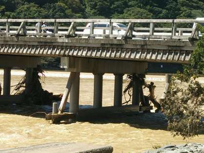 橋げたに流木が引っかかっていますが、道路はきれいに整備中です!