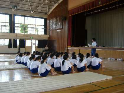 6時間目に、体育館において1年1・2組の女子は、教育実習生の中西先生の研究授業を行いました。