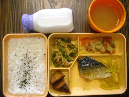 ごまごはん・さばの塩焼き・もやしのカレーソテー・れんこんの塩炒め・