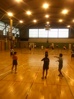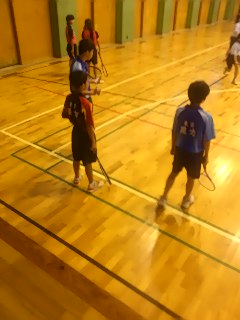 今日は卒業生が通っている、国本高校の練習に参加しています。昨日の雨でコートを整備中なので、ソフトテニス部専用の体育館で練習を始めました。