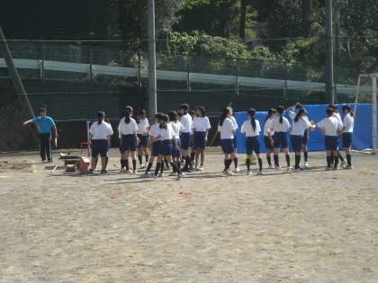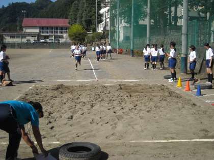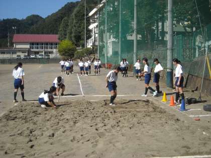 女子は校庭で練習の後に、走り幅跳びの測定を始めました。