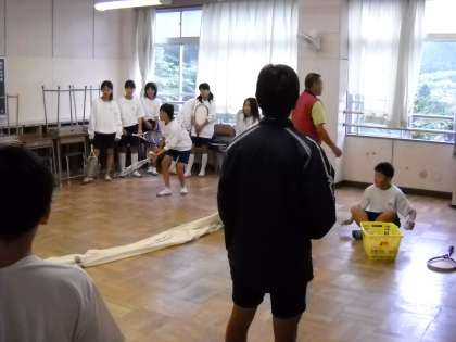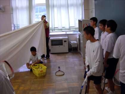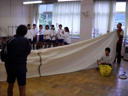 古い大きな布に向かって、ボールを打ち込んでいました。