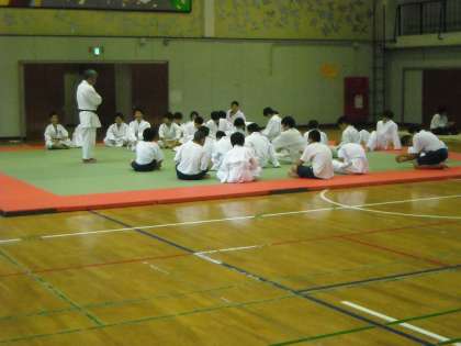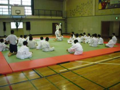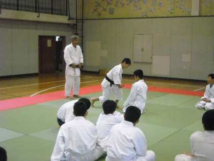 男子は体育館で柔道です。体育委員が見本を見せていました。