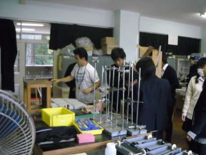 理科室で物体の運動とエネルギーについて実験を始めます。